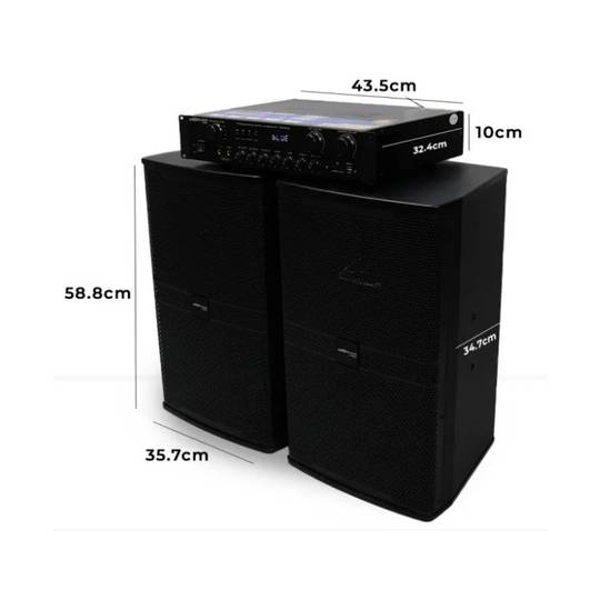 - Dimension: Speaker (L: 35.7 cm | W: 34.7 cm | H: 58.8 cm) Ampli (L: 43.5 cm | W: 32.4 cm | H: 10 cm)